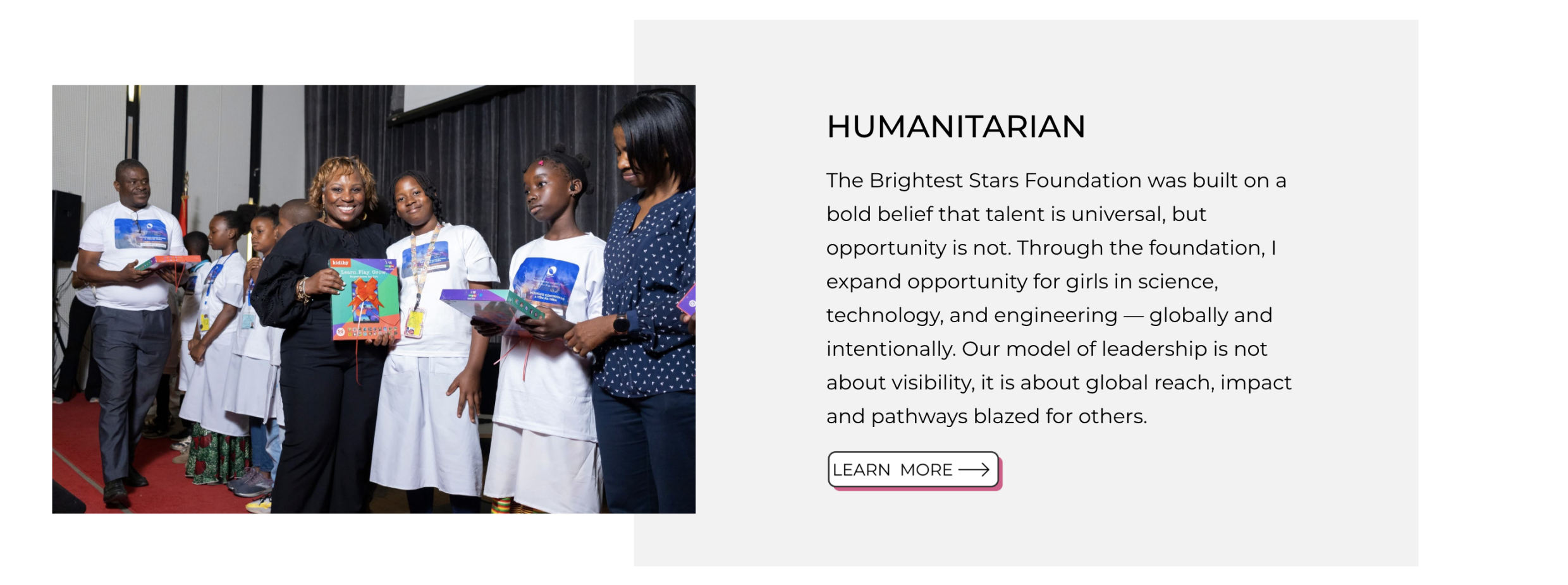 The Brightest Stars Foundation was built on a bold belief that talent is universal, but opportunity is not. Through the foundation, I expand opportunity for girls in science, technology, and engineering — globally and intentionally. Our model of leadership is not about visibility, it is about global reach, impact and pathways blazed for others.